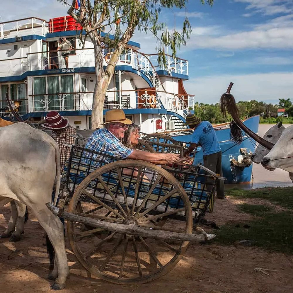 Wake early to enjoy sunrise and a morning Tai Chi session before breakfast. Visit Kampong Laeang and cycle through rice fields and villages known for pottery and palm sugar. After lunch onboard, cruise south to Kampong Tralach. Enjoy afternoon tea, then take an ox-cart ride through scenic countryside to visit a local NGO school and library, or explore a nearby 300-year-old temple.